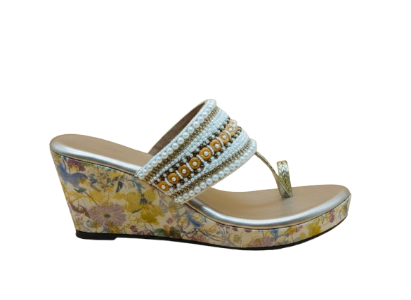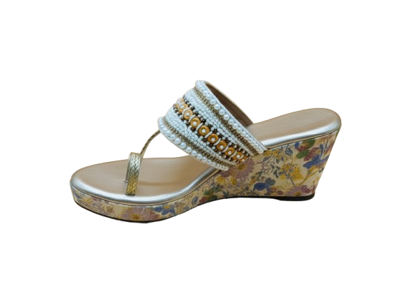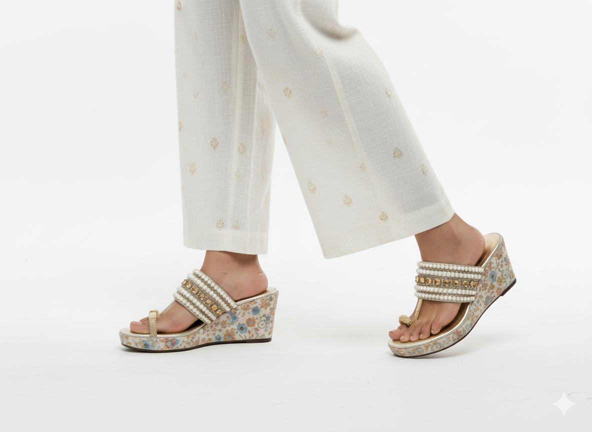Step into effortless elegance with this beautifully crafted wedge heel, designed to elevate your traditional and modern outfits. Featuring a richly embroidered floral wedge base and a stunning upper embellished with layered pearls and golden beadwork, this pair blends comfort with luxury.