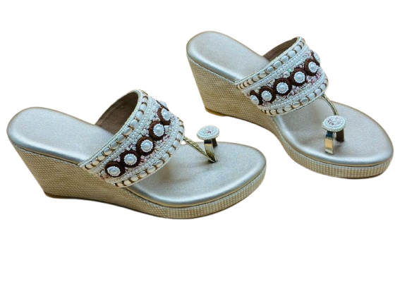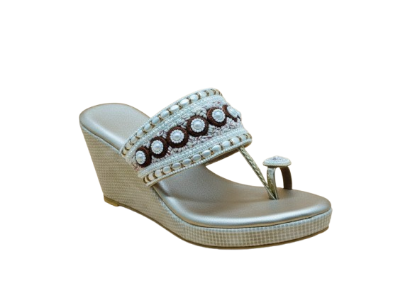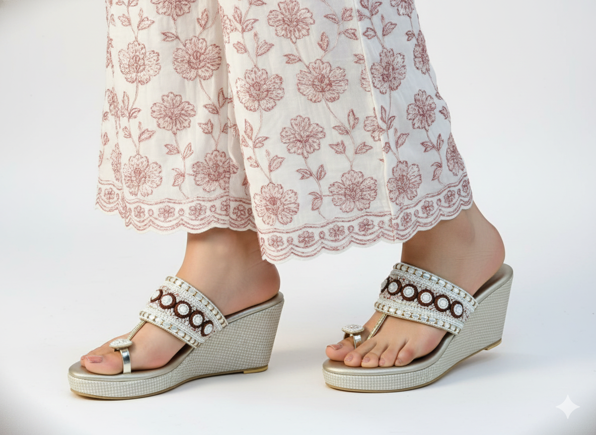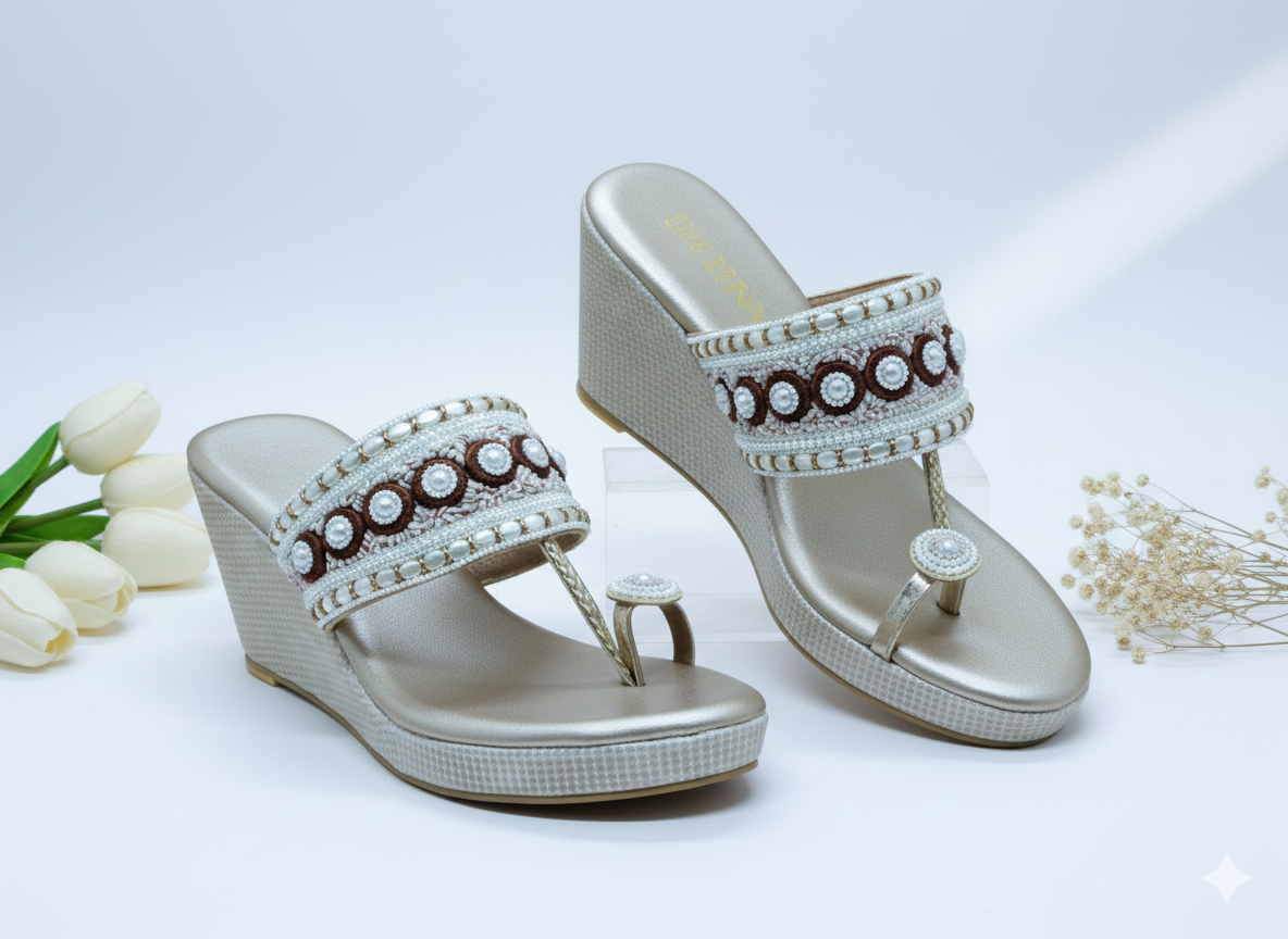 Step into festive elegance with the LeoraSteps PearlCraft Wedge Sandals, designed to add effortless glamour to every occasion. Crafted with meticulous hand-embellished detailing, these wedges feature shimmering pearls, intricate threadwork, and a premium metallic base that enhances your traditional as well as modern outfits.